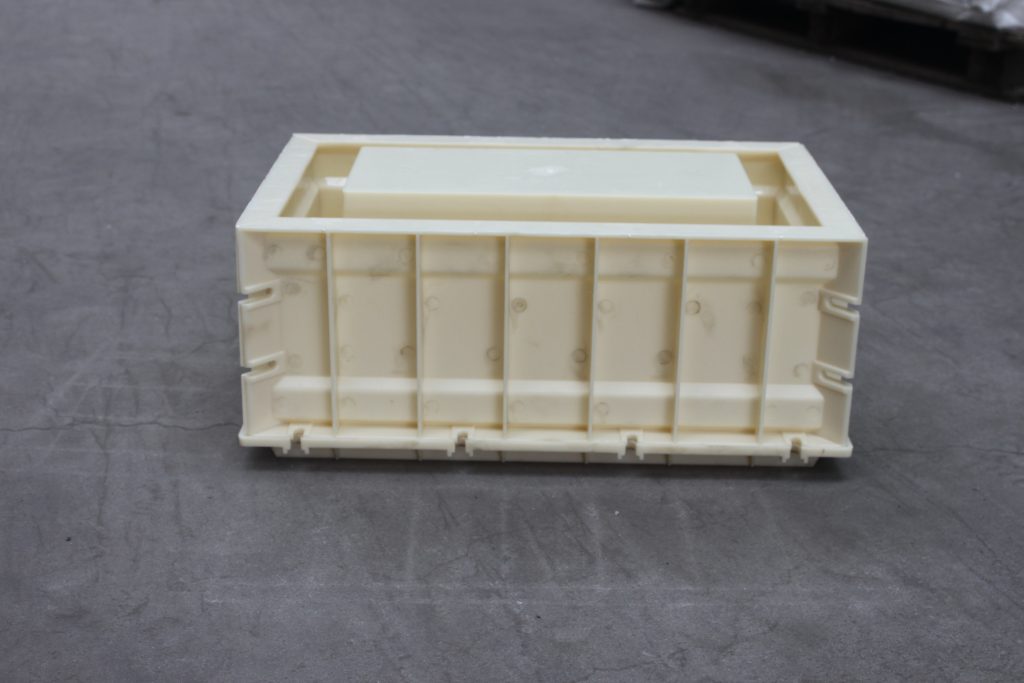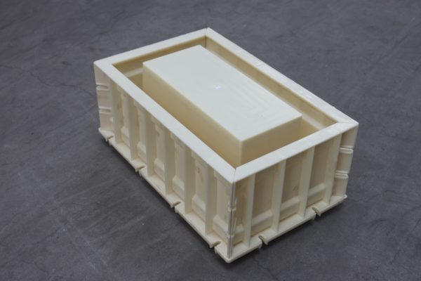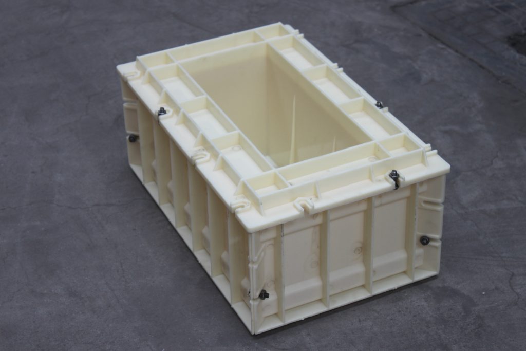 ABS材質的空心磚塑料模具,整體呈長方形樣式,總共分為三個部分,空心磚塑料模具底座、側面短板及側面長板,在長板與短板鏈接處均采用橢圓凹槽,用于鐵質螺絲螺帽拆卸裝配。鑒于塑料模具自身尺寸較大,為了使得空心磚塑料模具施工更為耐用牢固,在每一個配件背部分別采用十字加強筋設計,以確保正常施工。