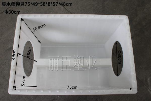 此款產(chǎn)品為客戶定制水泥集水槽模具,使用全新聚丙烯塑料原料,其中集水槽模具長度為75厘米,寬度為49厘米,深度積水區(qū)高度為57厘米,稍淺積水區(qū)為58.8厘米,實(shí)際高度深淺主要取決于預(yù)制水泥集水槽成品,具體詳細(xì)尺寸可參考下圖: