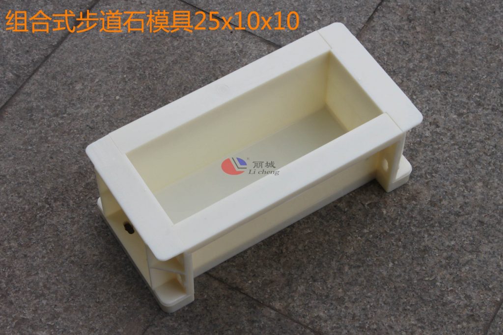 其塑料模具本身的規(guī)格的25x10x10cm,而堵在模具兩邊的堵頭規(guī)格為10x10cm。這樣的設(shè)計(jì)主要是對(duì)于步道石模具在澆筑成型后脫模過(guò)程中較為便利,只需將固定組步道石模具的鎖扣進(jìn)行拆除后,便能較為便利的進(jìn)行模具的脫模,所以麗臣在對(duì)著款模具上取名為組合式步道石模具。