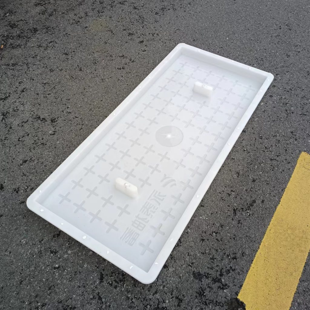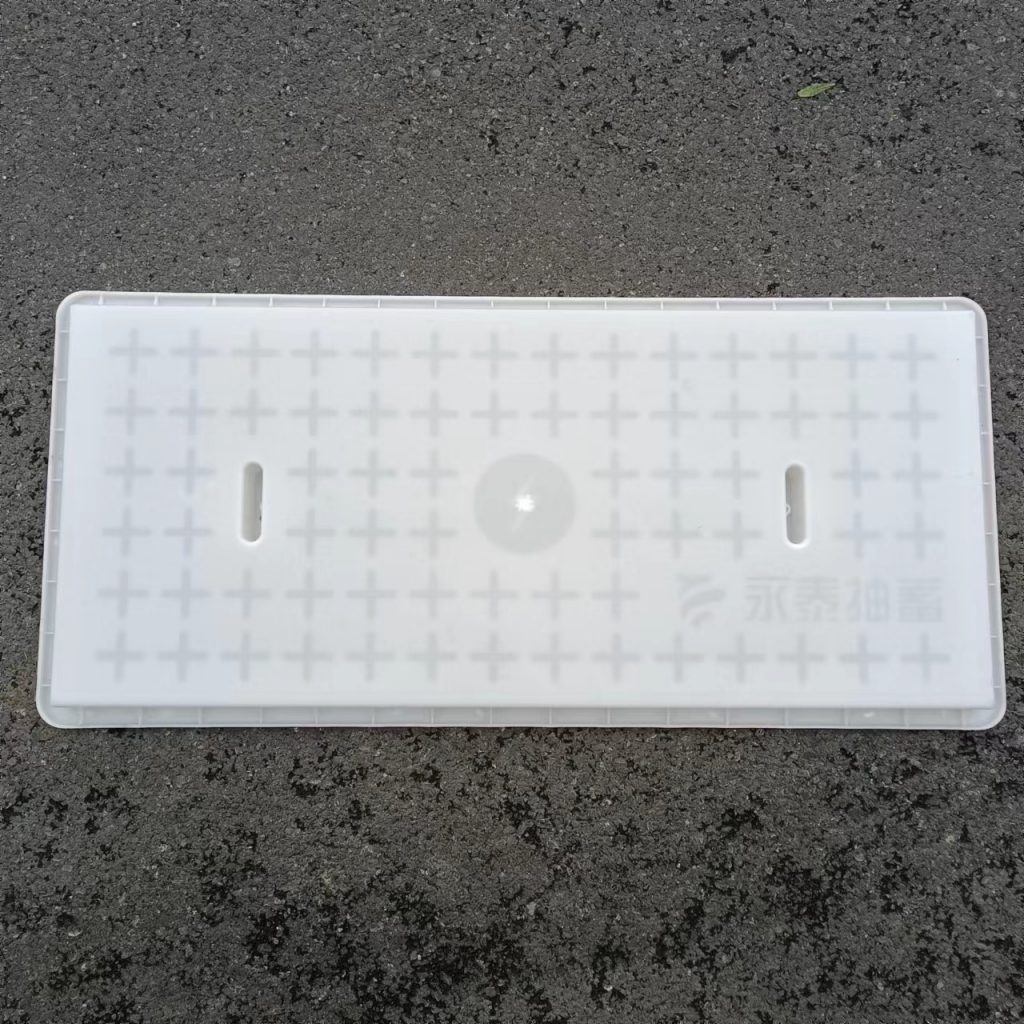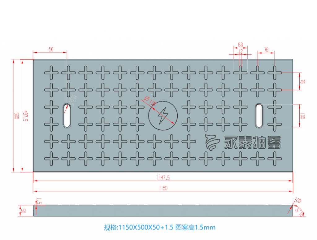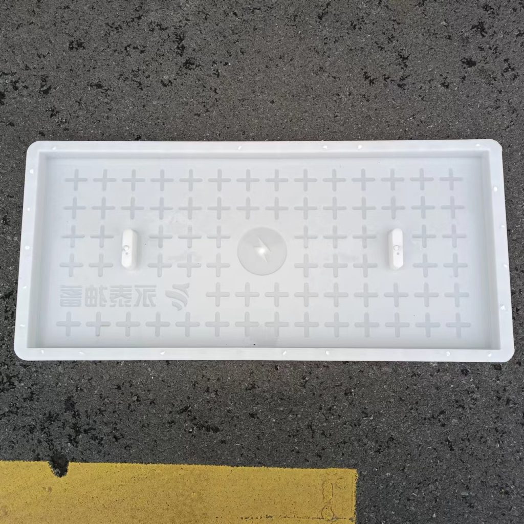 產(chǎn)品為米白色pp材質(zhì)制成,版面帶十字花紋,中心帶有電力標志,兩側(cè)帶二孔,方便提拉,右下角帶有“永泰抽蓄”四字,為客戶定制產(chǎn)品,模具尺寸還有90cm長度,里面花紋基本一至,預制成型后電力蓋板。